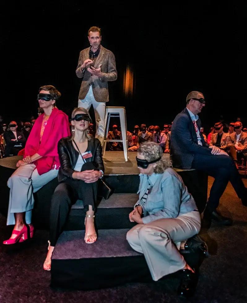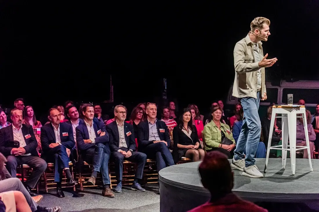 Joost Rigter sprak over verandering en de impact ervan. Tot de leeftijd van 26 jaar kon Joost zien; vandaag is zijn zicht beperkt tot 0.8%. Joost liet het geblinddoekte publiek zelf ervaren wat de persoonlijke weerstanden zijn tegen verandering. Hij legde uit hoe je je gedachten kan herprogrammeren zodat je uit je comfortzone kan treden en beter kan omgaan met veranderingen.